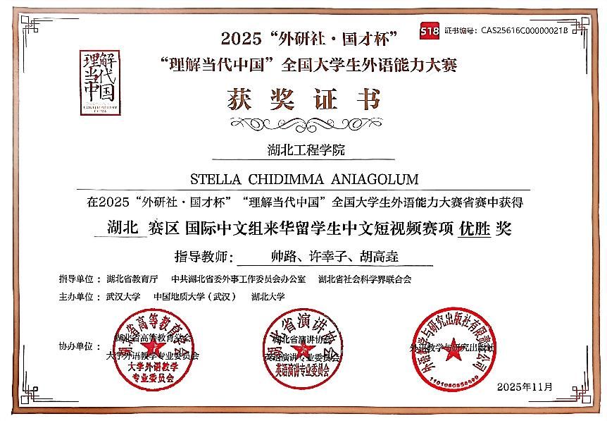 近日,2025“外研社・国才杯”“理解当代中国” 全国大学生外语能力大赛湖北省赛圆满落幕。我校国际学生 STELLA CHIDIMMA ANIAGOLUM(中文名:美丽)凭借出色的表现脱颖而出,在国际中文组短视频赛项中荣获优胜奖。